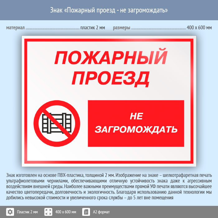 Знак «Пожарный проезд - не загромождать», КЗ-67 (пластик, 600х400 мм) в Пензе купить