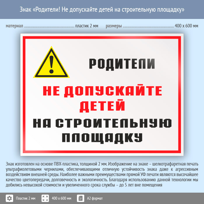 Знак «Родители! Не допускайте детей на строительную площадку», КЗ-84 (пластик, 600х400 мм) в Пензе купить