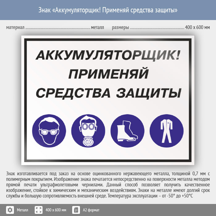 Знак «Аккумуляторщик! Применяй средства защиты», КЗ-02 (металл, 600х400 мм) в Пензе купить