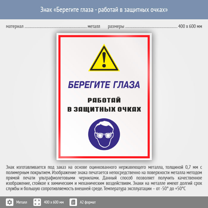 Знак «Берегите глаза - работай в защитных очках», КЗ-04 (металл, 400х600 мм) в Пензе купить
