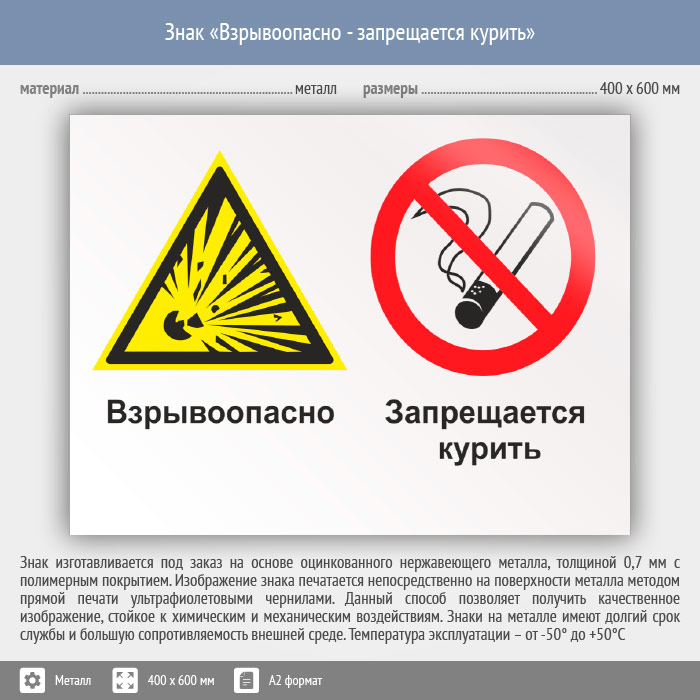 Знак «Взрывоопасно - запрещается курить», КЗ-06 (металл, 600х400 мм) в Пензе купить