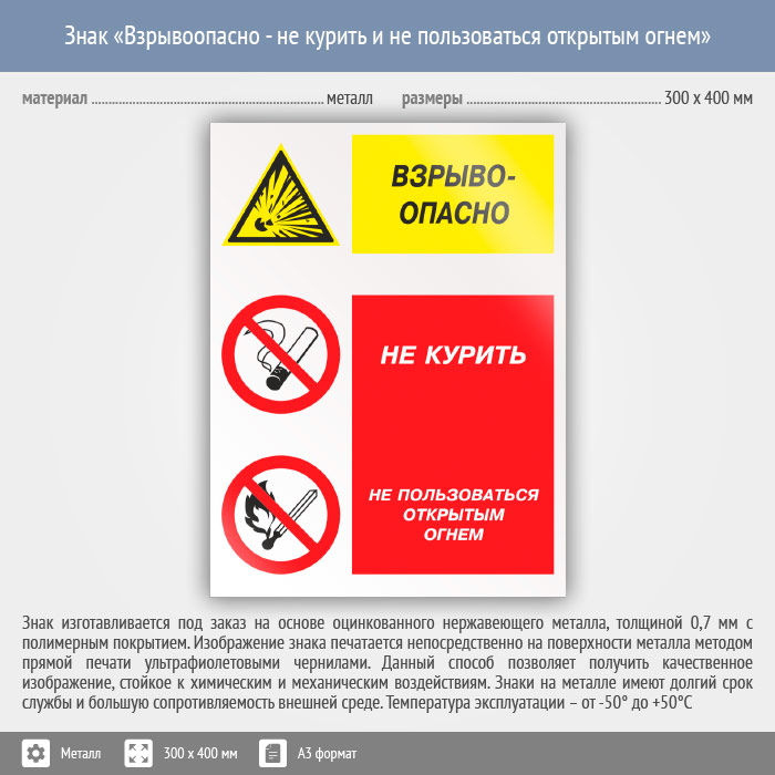 Знак «Взрывоопасно - не курить и не пользоваться открытым огнем», КЗ-08 (металл, 300х400 мм) в Пензе купить