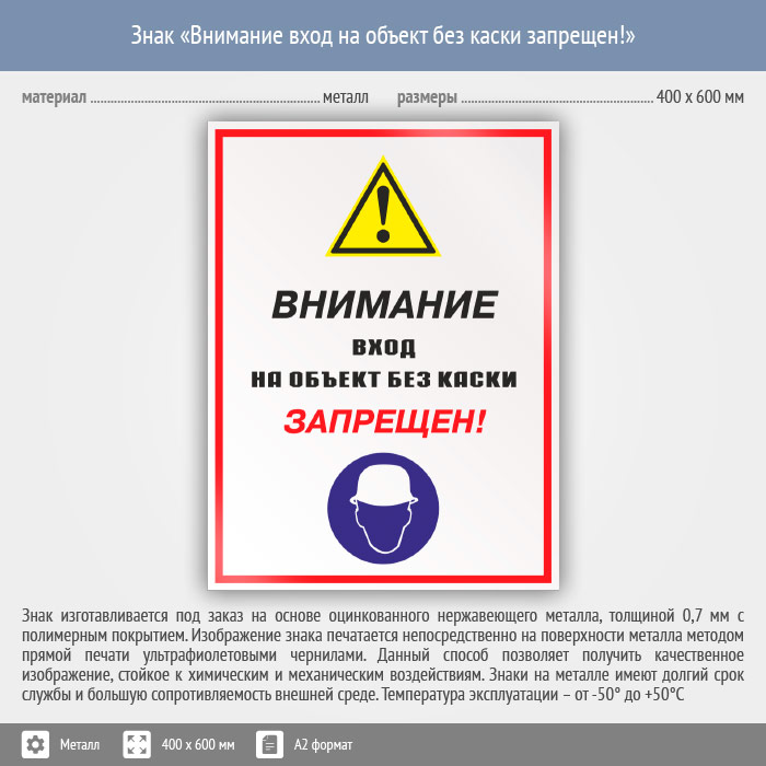 Знак «Внимание вход на объект без каски запрещен!», КЗ-13 (металл, 400х600 мм) в Пензе купить