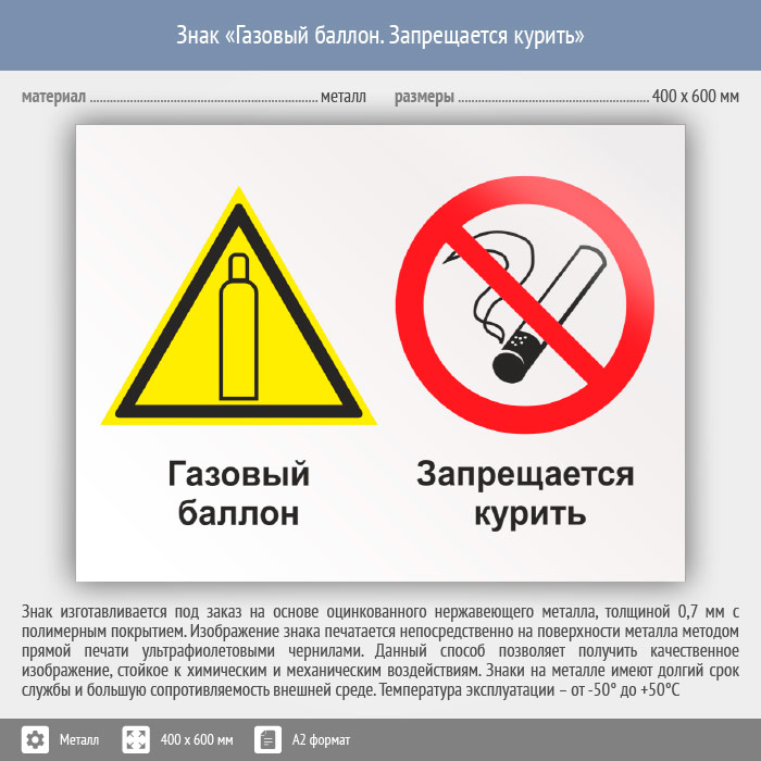 Знак «Газовый баллон. Запрещается курить», КЗ-18 (металл, 600х400 мм) в Пензе купить
