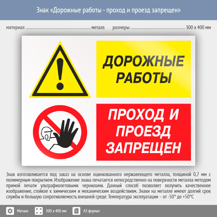 Знак «Дорожные работы - проход и проезд запрещен», КЗ-20 (металл, 400х300 мм) в Пензе купить