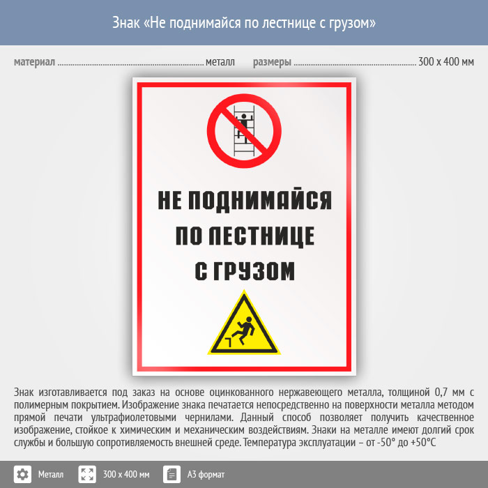 Знак «Не поднимайся по лестнице с грузом», КЗ-28 (металл, 300х400 мм) в Пензе купить