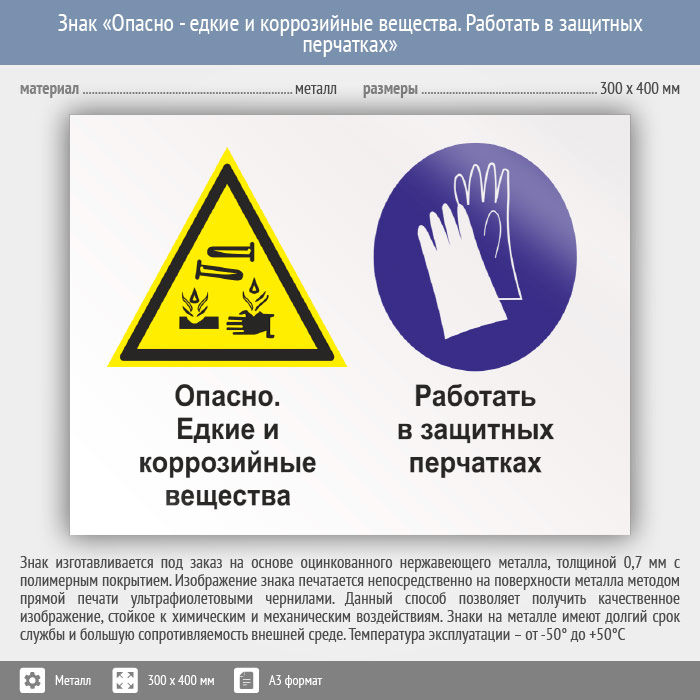 Знак «Опасно - едкие и коррозийные вещества. Работать в защитных перчатках», КЗ-36 (металл, 400х300 мм) в Пензе купить