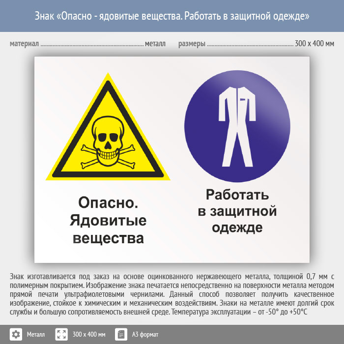 Знак «Опасно - ядовитые вещества. Работать в защитной одежде», КЗ-42 (металл, 400х300 мм) в Пензе купить