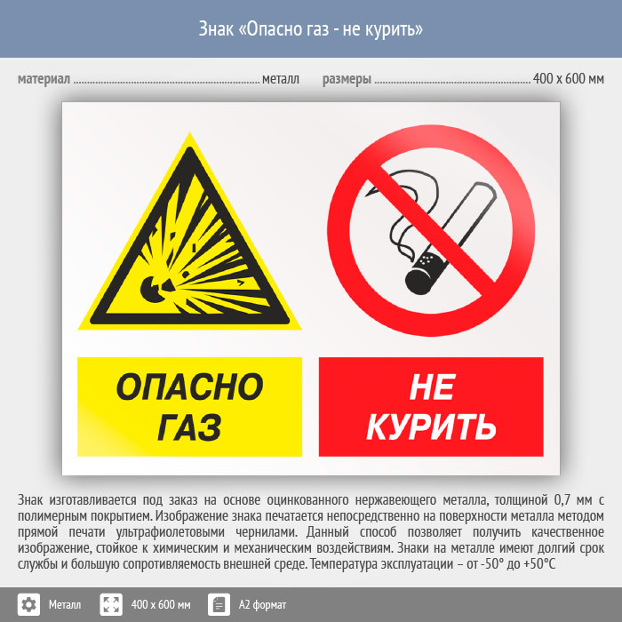 Знак «Опасно газ - не курить», КЗ-44 (металл, 600х400 мм) в Пензе купить