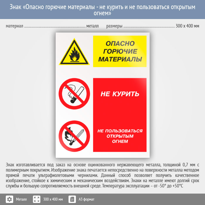 Знак «Опасно горючие материалы - не курить и не пользоваться открытым огнем», КЗ-45 (металл, 300х400 мм) в Пензе купить