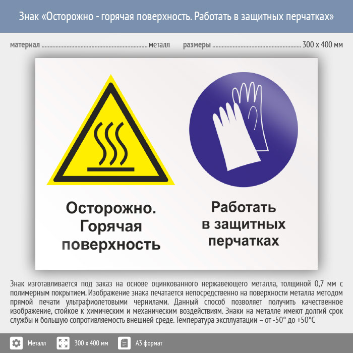 Знак «Осторожно - горячая поверхность. Работать в защитных перчатках», КЗ-55 (металл, 400х300 мм) в Пензе купить