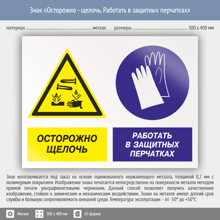 Знак «Осторожно - щелочь. Работать в защитных перчатках», КЗ-60 (металл, 400х300 мм) в Пензе купить