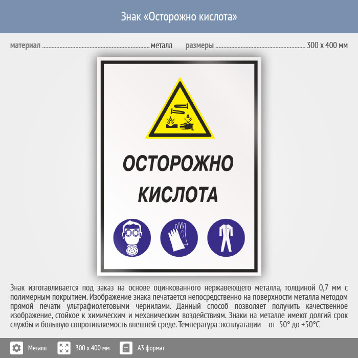 Знак «Осторожно кислота», КЗ-61 (металл, 300х400 мм) в Пензе купить