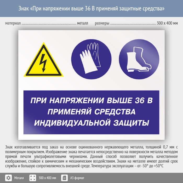Знак «При напряжении выше 36 В применяй защитные средства», КЗ-71 (металл, 400х300 мм) в Пензе купить