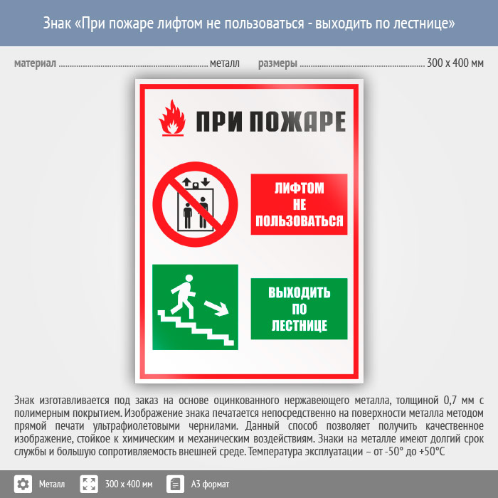 Знак «При пожаре лифтом не пользоваться - выходить по лестнице», КЗ-73 (металл, 300х400 мм) в Пензе купить