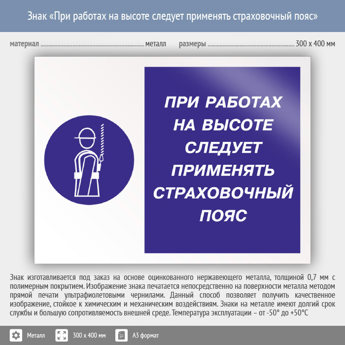 Знак «При работах на высоте следует применять страховочный пояс», КЗ-75 (металл, 400х300 мм) в Пензе купить