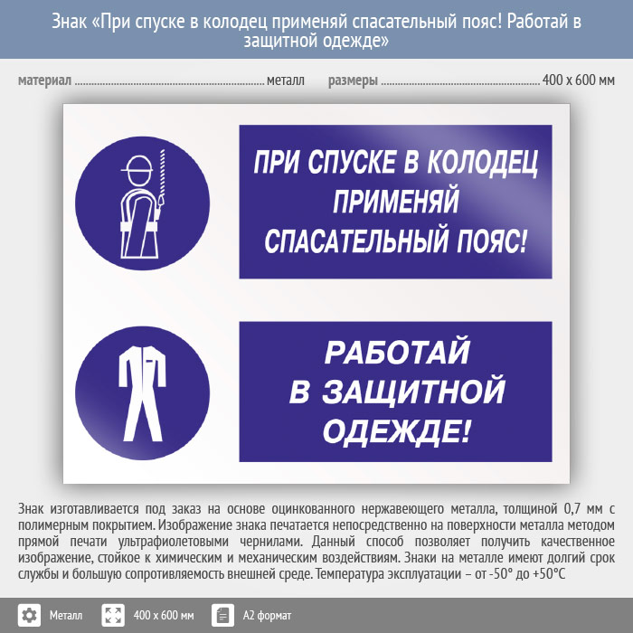 Знак «При спуске в колодец применяй спасательный пояс! Работай в защитной одежде», КЗ-76 (металл, 600х400 мм) в Пензе купить