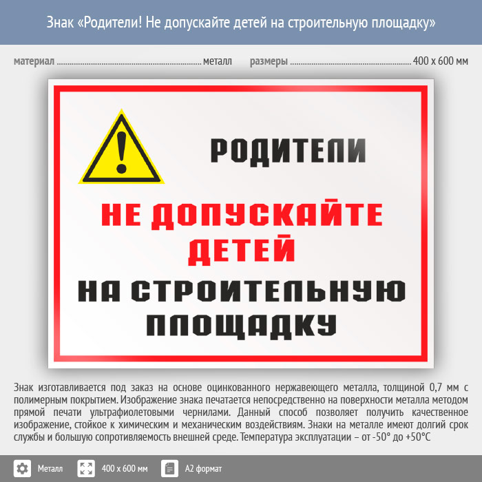 Знак «Родители! Не допускайте детей на строительную площадку», КЗ-84 (металл, 600х400 мм) в Пензе купить