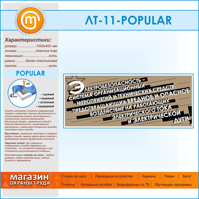 Предлагаем Вашему вниманию стенд с лозунгом «Электробезопасность — система организационных мероприятий и технических средств, предотвращающих вредное и опасное воздействие на работающих от электрического тока и электрической дуги»