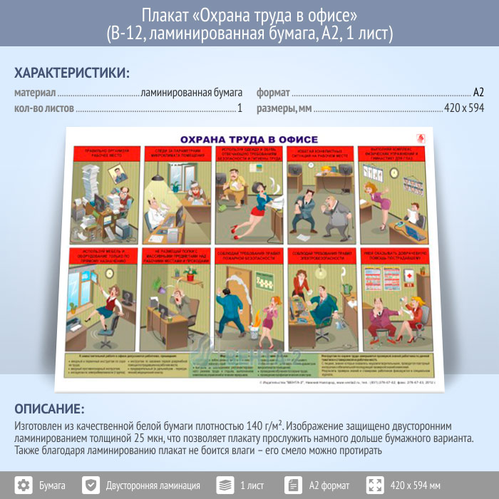 Плакат «Охрана труда в офисе» (В-12, ламинированная бумага, А2, 1 лист) в Пензе купить