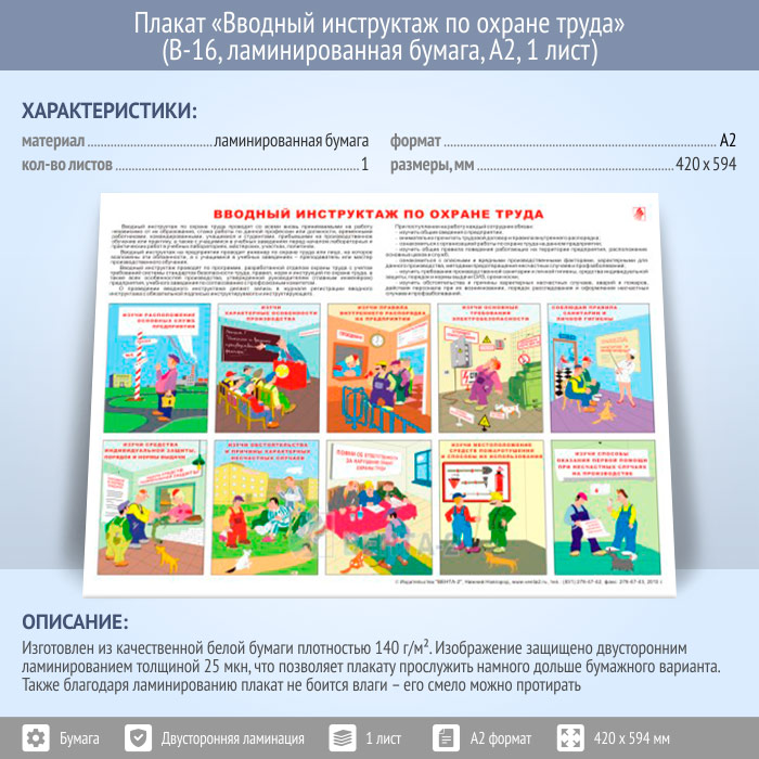 Плакат «Вводный инструктаж по охране труда» (В-16, ламинированная бумага, А2, 1 лист) в Пензе купить