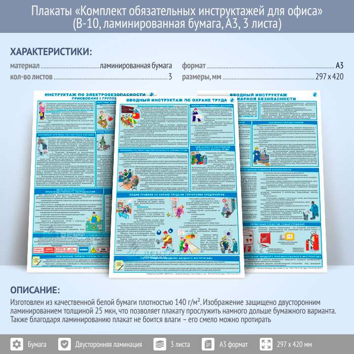 Плакаты «Комплект обязательных инструктажей для офиса» (В-10, ламинированная бумага, А3, 3 листа) в Пензе купить
