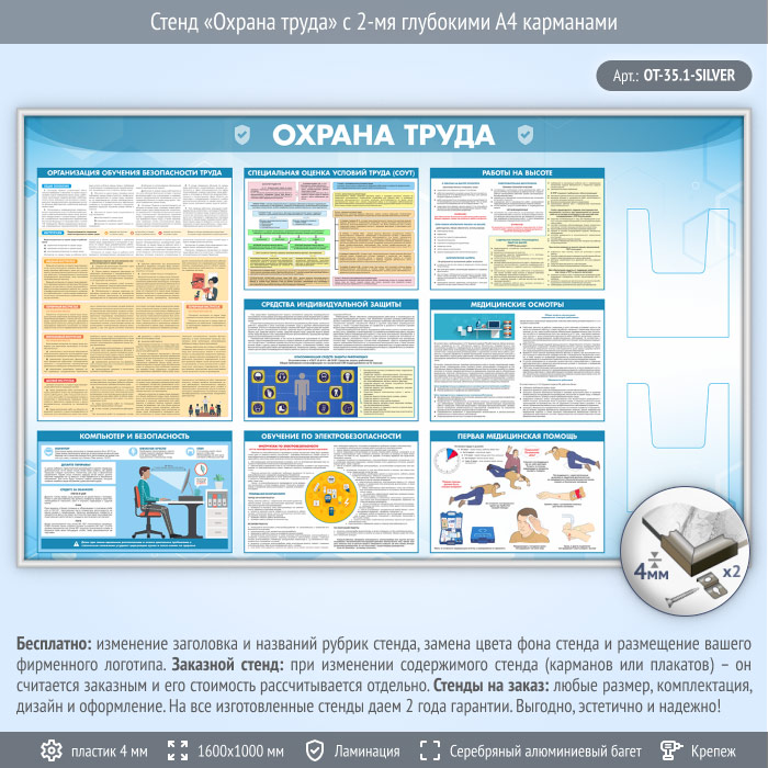 Стенд «Охрана труда» с 2-мя глубокими А4 карманами (OT-35.1-SILVER) в Пензе купить