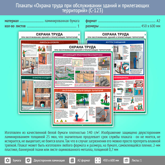 Плакаты «Охрана труда при обслуживании зданий и прилегающих территорий» (С-123, ламинированная бумага, А2, 3 листа) в Пензе купить
