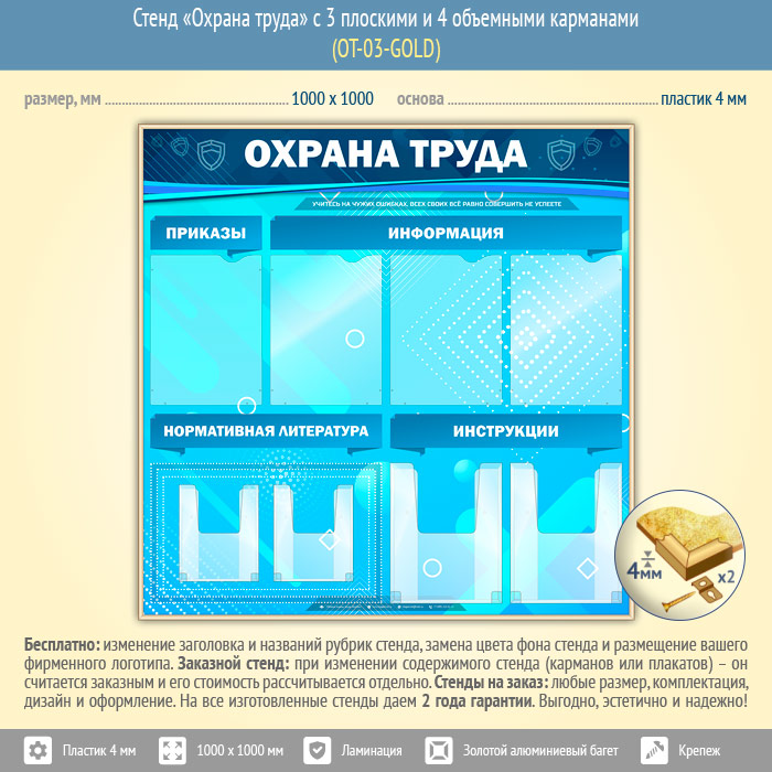 Стенд «Охрана труда» с 4 плоскими и 4 объемными карманами (OT-03-GOLD) в Пензе купить
