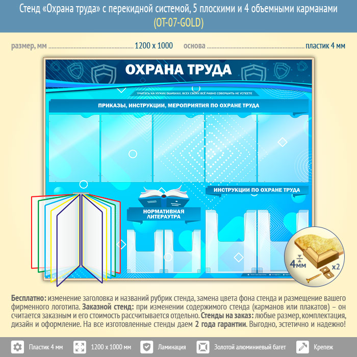 Стенд «Охрана труда» с перекидной системой, 5 плоскими и 4 объемными карманами (OT-07-GOLD) в Пензе купить