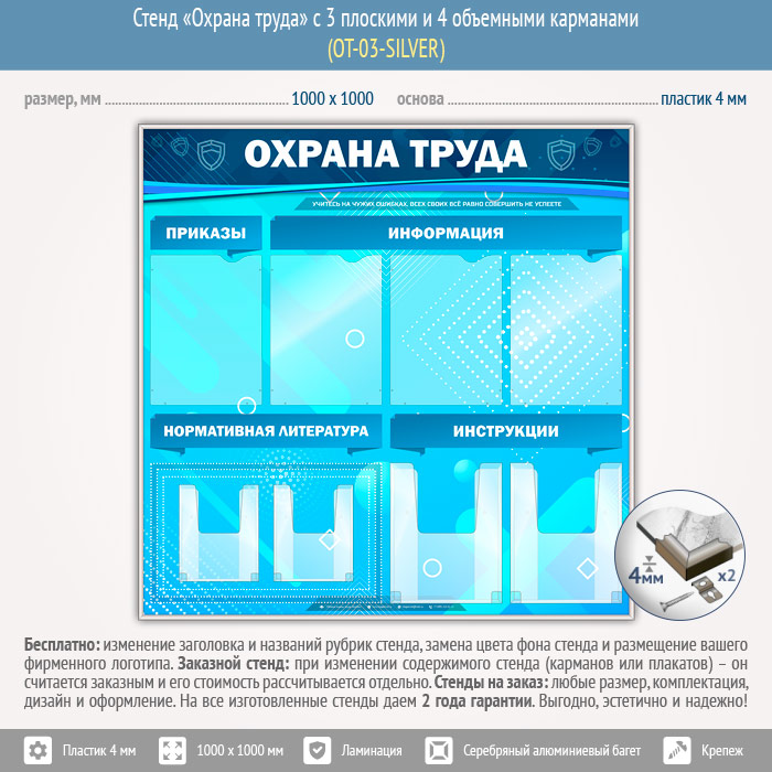 Стенд «Охрана труда» с 4 плоскими и 4 объемными карманами (OT-03-SILVER) в Пензе купить