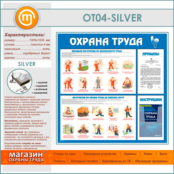 Стенд «Охрана труда» с плоским и объемным карманами (OT-04-SILVER) в Пензе купить