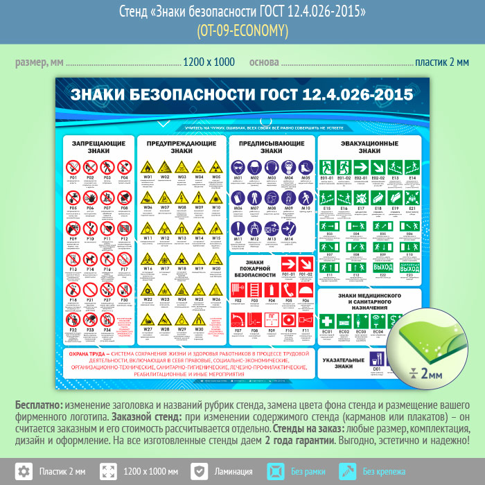 Стенд «Знаки безопасности ГОСТ 12.4.026-2015» (OT-09-ECONOMY) в Пензе купить