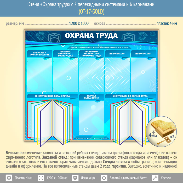 Стенд «Охрана труда» с 2 перекидными системами и 6 карманами (OT-17-GOLD) в Пензе купить