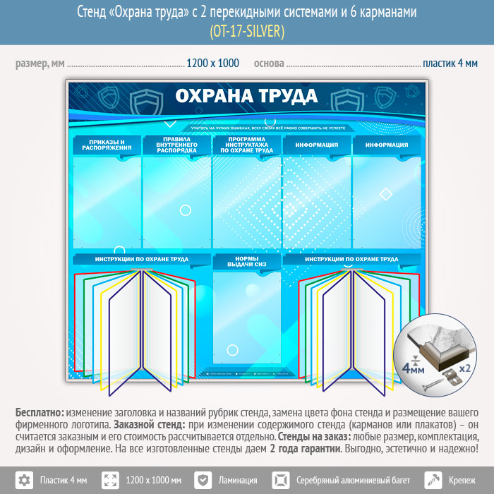 Стенд «Охрана труда» с 2 перекидными системами и 6 карманами (OT-17-SILVER) в Пензе купить