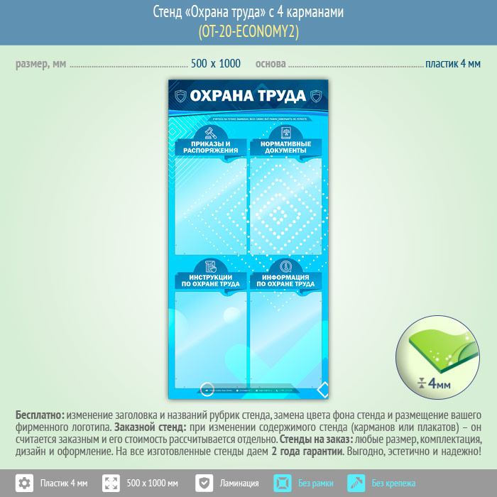 Стенд «Охрана труда» с 4 карманами (OT-20-ECONOMY2) в Пензе купить