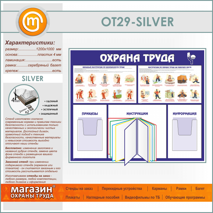 Стенд «Охрана труда» с перекидной системой и 2 объемными карманами (OT-29-SILVER) в Пензе купить