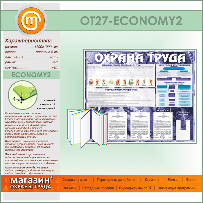 Стенд «Охрана труда» с перекидной системой, 3 плоскими и 1 объемным карманом (OT-27-ECONOMY2) в Пензе купить