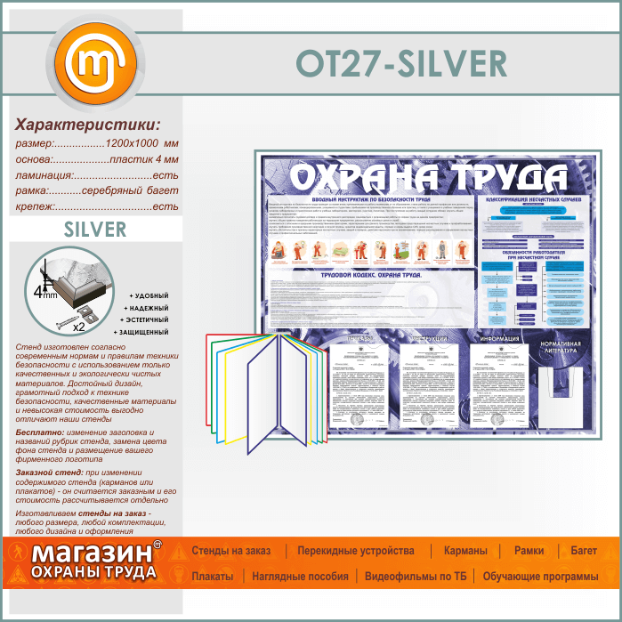 Стенд «Охрана труда» с перекидной системой, 3 плоскими и 1 объемным карманом (OT-27-SILVER) в Пензе купить