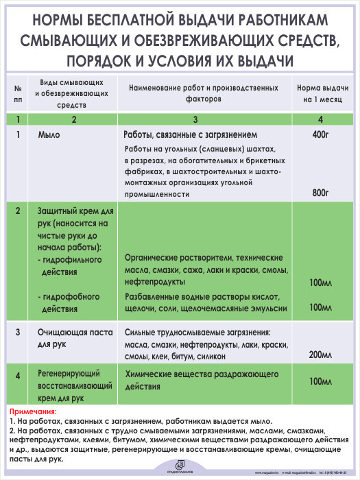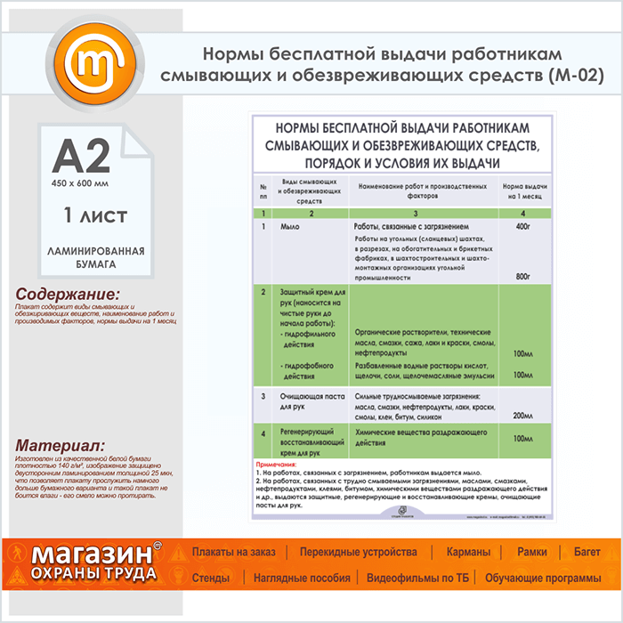Плакат «Нормы бесплатной выдачи работникам смывающих и обезвреживающих средств» (М-02, ламинированная бумага, А2, 1 лист) в Пензе купить