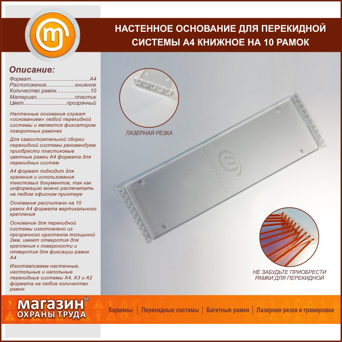 Настенное основание для перекидной системы А4 книжное на 10 рамок (оргстекло) в Пензе купить