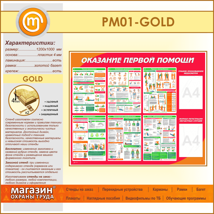 Стенд «Оказание первой помощи» с плоским и объемным карманами (PM-01-GOLD) в Пензе купить
