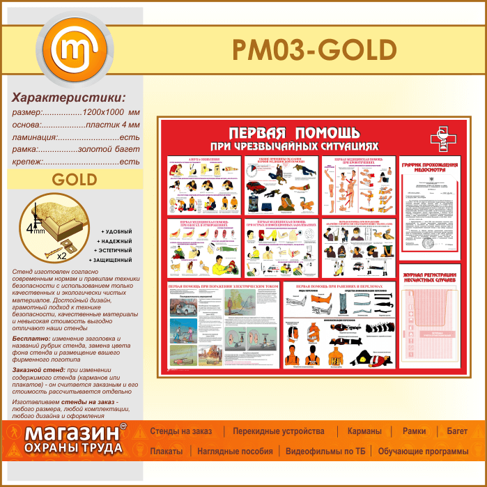 Стенд «Первая помощь при чрезвычайных ситуациях» с плоским и объемным карманами (PM-03-GOLD) в Пензе купить