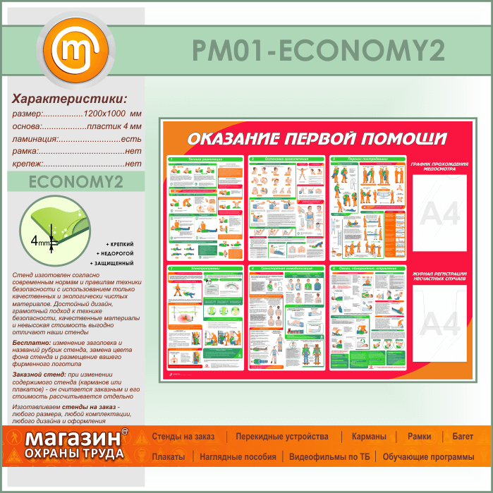 Стенд «Оказание первой помощи» с плоским и объемным карманами (PM-01-ECONOMY2) в Пензе купить