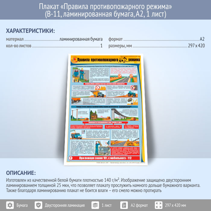 Плакат «Правила противопожарного режима» (В-11, ламинированная бумага, А2, 1 лист) в Пензе купить