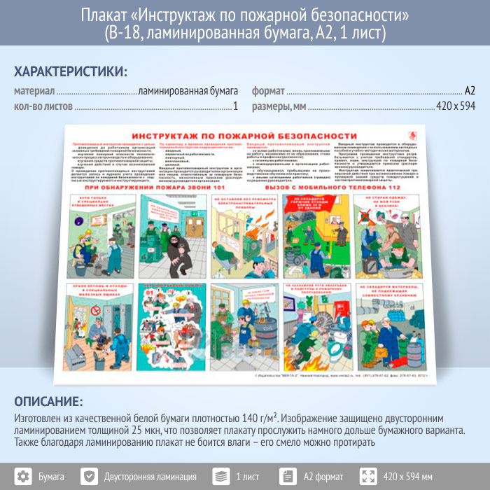 Плакат «Инструктаж по пожарной безопасности» (В-18, ламинированная бумага, А2, 1 лист) в Пензе купить