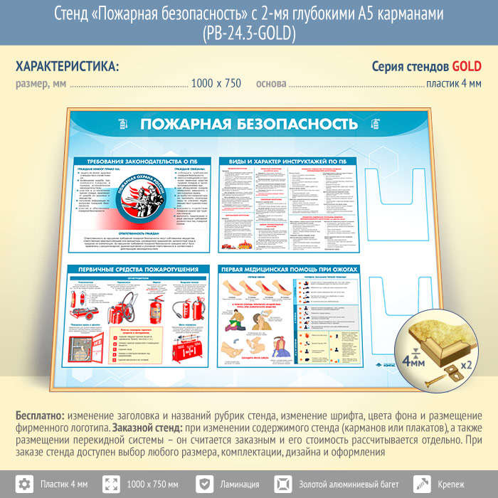 Стенд «Пожарная безопасность» с 2-мя глубокими А5 карманами (PB-24.3-GOLD) в Пензе купить