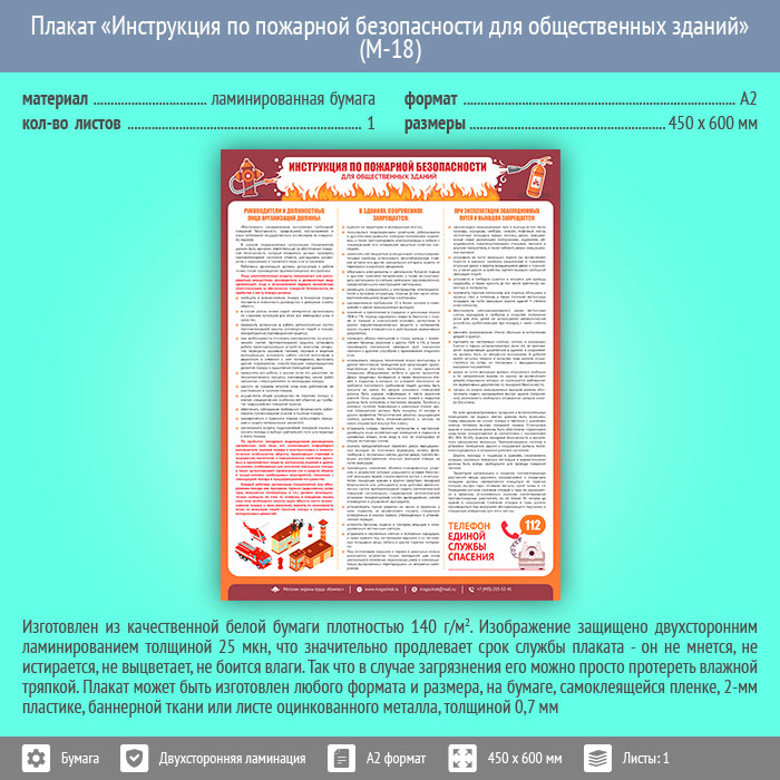 Плакат «Инструкция по пожарной безопасности для общественных зданий» (М-18, ламинированная бумага, А2, 1 лист) в Пензе купить