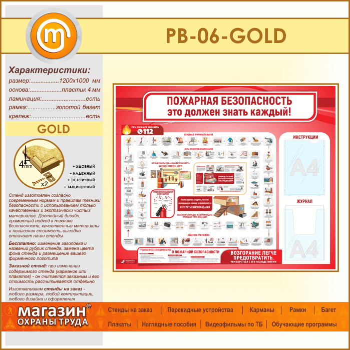 Стенд «Пожарная безопасность. Это должен знать каждый» с плоским и объемным карманами (PB-06-GOLD) в Пензе купить