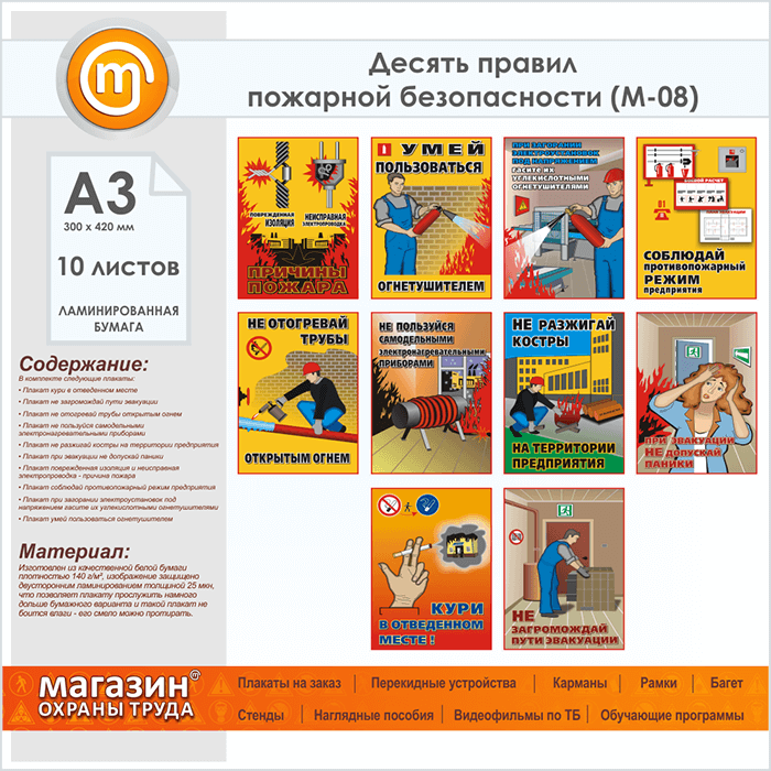 Плакаты «Десять правил пожарной безопасности» (М-08, ламинированная бумага, А3, 10 листов) в Пензе купить